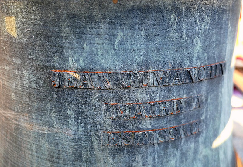 Deux inscriptions anciennes gravées sur la cloche sont bien visibles : « François Joseph Bournez – Fondeur à Morteau » et « Jean Dumanchin – Maire à Estissac ». Pour information, Jean Dumanchin a exercé la fonction de maire à Estissac entre 1852 et 1870, ce qui permet de supposer que cette cloche date de cette période.